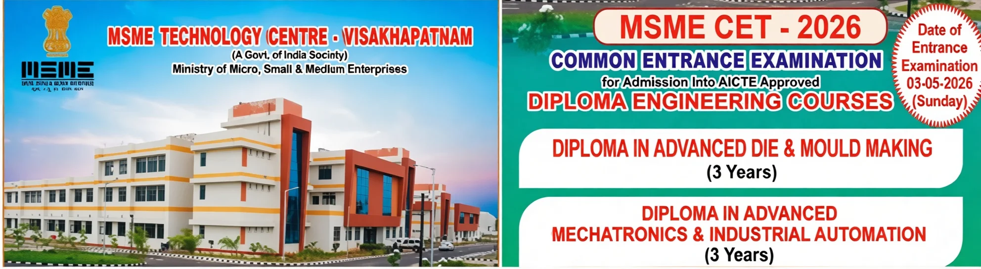 MSME Technology Centre, Visakhapatnam is the premium skill development centre established through the Ministry of Micro, Small and Medium Enterprises, Govt. of India under the auspices of World Bank. The primary objective of the TC is to provide the world-class education, skill development training and conduct innovation research at the interface of multiple disciplines to create high quality human resources in disciplinary and interdisciplinary areas of Engineering Technologies.